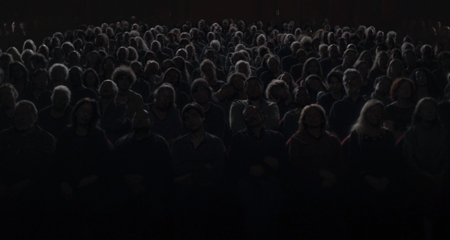I first had this image of a large, full cinema that is darkened for the film screening. But the members of the audience are completely frozen and their eyes seem to be shut. Are they asleep? Dead? The cinema audience seen from front on – something no one ever sees (apart from in the extraordinary final shot of The Crowd by King Vidor).