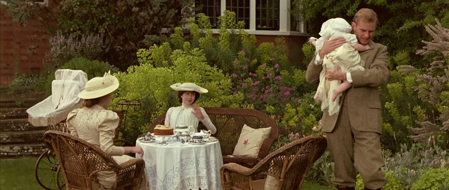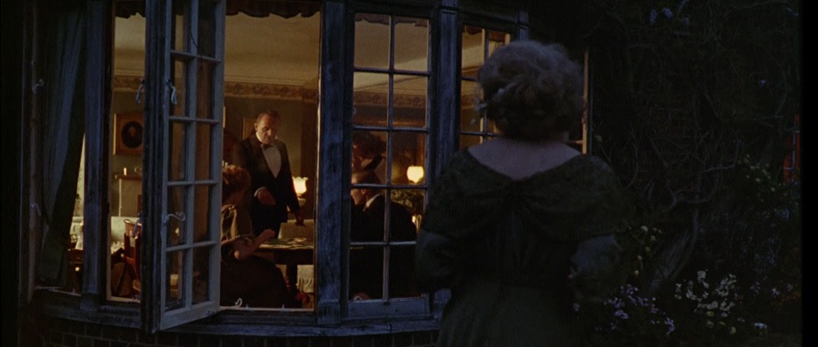 ฉากแรกของหนังชวนให้ผมระลึกถึงภาพยนตร์ Cries and Whisper (1972) เริ่มต้นที่ Mrs. Wilcox ก้าวออกเดินอย่างเรื่อยเปื่อยไปรอบๆบ้านชนบท Howards End แสดงถึงความเพ้อรำพัน ใฝ่ฝันถึงบางสิ่งอย่างที่ตนเองไม่เคยได้รับ มองเข้าไปภายในห้องหับพบเห็นสามีพร้อมแขกเหรื่อ ดูอบอุ่น พูดคุยกันอย่างสนุกสนาน แต่เธอกลับยืนอยู่ภายนอกอย่างโดดเดี่ยวลำพัง หนาวเหน็บถึงขั้วหัวใจ