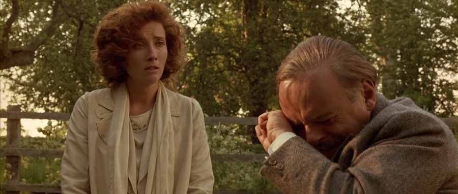 - ส่วนอีกฉากจะกลับตารปัตรตรงกันข้าม ระหว่างพยายามร่ำร้องขอ Henry เพียงแค่ค่ำคืนนี้ต้องการให้น้องสาวพำนักอาศัยอยู่ยัง Howards End ทั้งๆมันไม่ควรเป็นเรื่องยุ่งยาก วุ่นวายใหญ่โต แต่คำปฏิเสธดื้อรั้นหัวชนฝาของเขา ทำเอาตัวละครมาถึงจุดแตกหัก ทำไมสิ่งที่ฉันเคยยกโทษให้อภัย เขากลับไม่สามารถแสดงออกแบบเดียวกันได้!