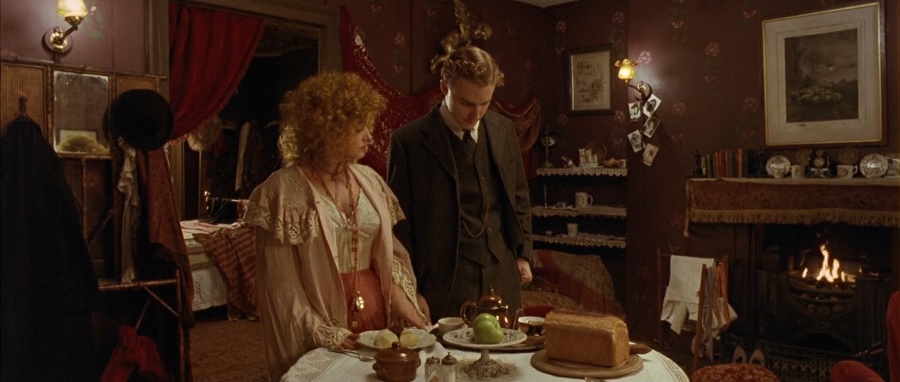 อพาร์ทเม้นท์ของ Leonard Bast มีสภาพเก่าๆ ชำรุดทรุดโทรม ค่าเช่าคงราคาไม่สูงมาก (เป็นห้องพักเหมาะสมกับชนชั้นฐานะ Lower-Middle Class) โทนสีแดงเข้มๆ (แสดงถึงอันตราย ความโชคร้าย ชีวิตที่ต้องต่อสู้ดิ้นรนด้วยหยาดเหงื่อแรงกาย) และยังอยู่ใกล้สถานีรถไฟ ทำให้บ่อยครั้งได้ยินเสียง แสงจากภายนอกสาดส่องเข้ามา และทั้งห้องพักสั่นสะเทือนเลือนลั่น (สามารถสะท้อนสภาวะทางจิตใจตัวละครที่เต็มไปด้วยความหวาดหวั่นกลัว ตัวสั่นเทา ไม่รู้ว่าวันพรุ่งนี้จักมีข้าวกิน เอาตัวชีพรอดได้อย่างไร)