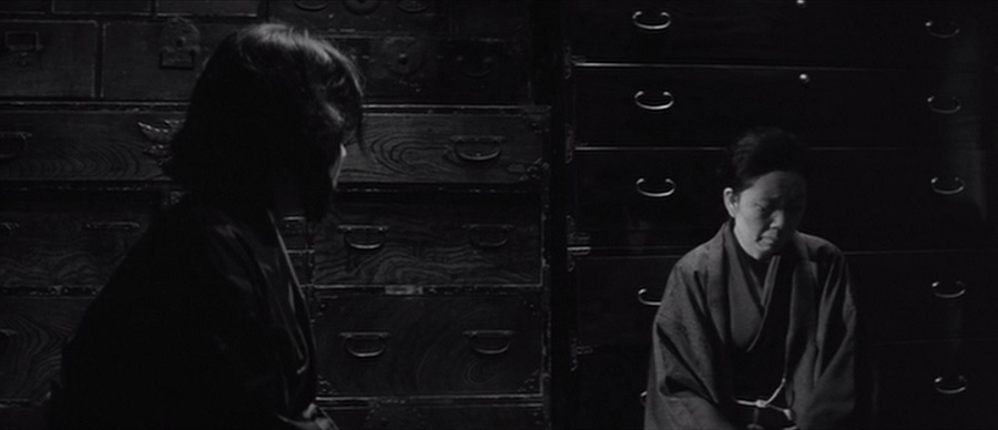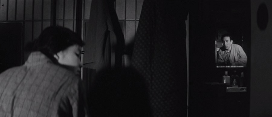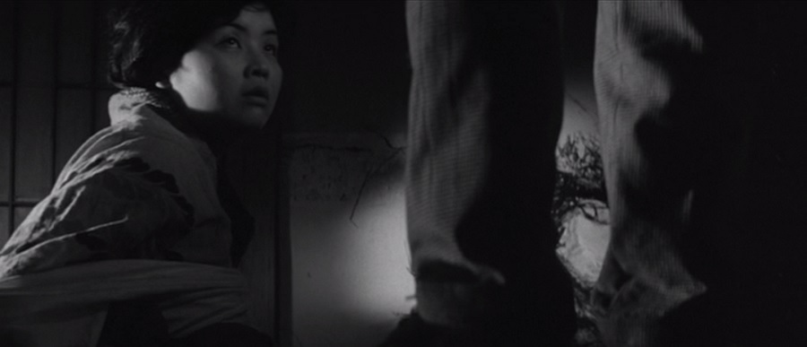 การมาถึงของโจรปลุก Sadako ให้ตื่นลุกขึ้นจากที่นอนบนพื้น ภาพช็อตนี้พบเห็นขาของเขาอยู่ระนาบเดียวสาตาของหญิงสาว นี่เป็นการสะท้อนเปรียบเทียบถึงการมองเธอเป็นคนระดับต่ำต้อยกว่า