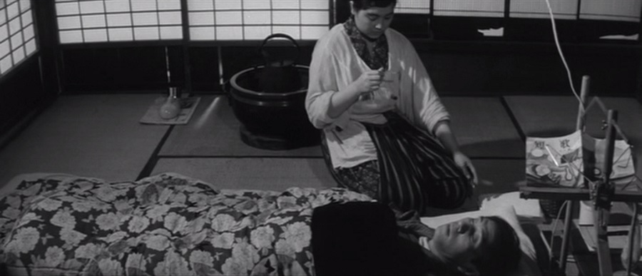 ครุ่นคิดถึงการได้มาของสามี นี่เป็นอีกย้อนอดีต (Flashback) ตอนที่ Sadako โตขึ้นเป็นสาวแล้ว ทำงานเป็นคนใช้ปรนิบัติดูแลเจ้านายป่วยไข้ แต่ก็ไม่รู้พิศวาสร่านอะไรไวปานนั้น ซึ่งพอดีกับแม่เปิดประตูเข้ามาพบเห็น สามารถเข้าใจได้ทันทีถึงความเคียดแค้นปฏิเสธไม่ยอมรับลูกสะใภ้คนนี้เสียงขันแข็ง แต่แท้จริงมันคือสนองกรรมตนเองที่เคยทุบตีเด็กสาวไว้เมื่อคราก่อน