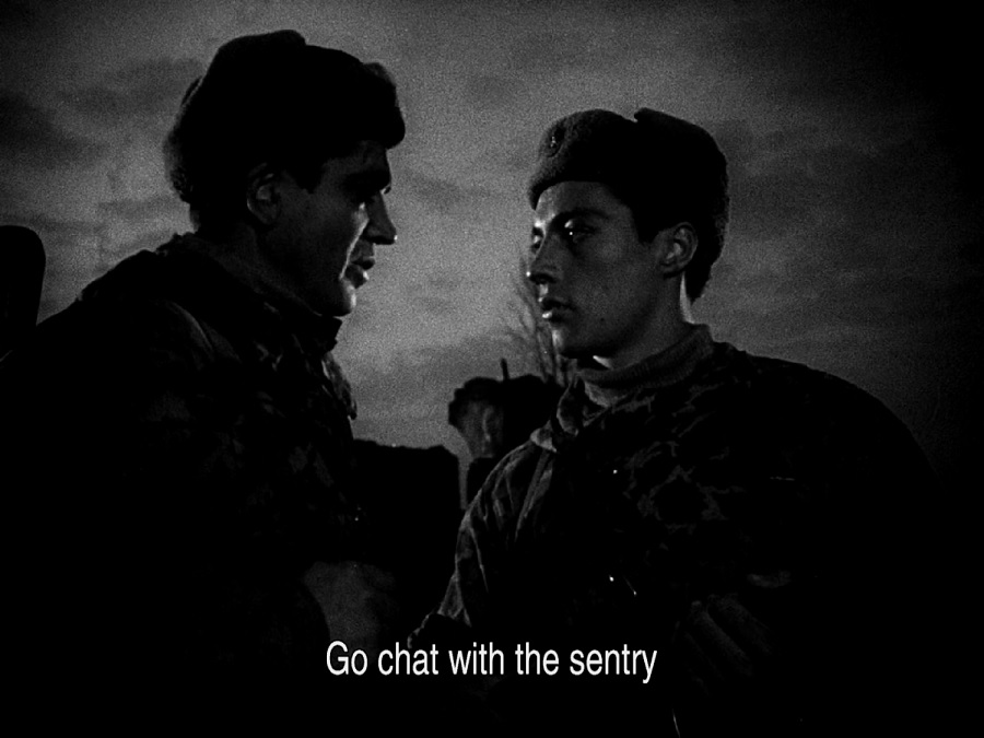 จบลงด้วยช็อตนี้ที่นักแสดงทั้งสามยืนไล่เรียงลำดับความสำคัญต่อ Ivan อยู่ใกล้กล้องมากสุด ตามด้วย Capt. Kholin และ Lt. Galtsev ชายแปลกหน้าที่เพิ่งรับรู้จักยืนเบลอๆหลังสุด