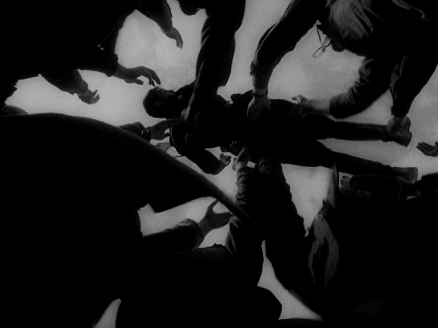 ภาพแรกหลังประการชัยชนะสงครามโลกครั้งที่สอง ถ่ายจากมุม Ant’s Eye View พบเห็นผองเพื่อนโยนตัวทหารนายหนึ่งขึ้นฟ้า มองไปมองมามันช่างละม้ายคล้ายช็อตที่เศษซากไม้ดูราวกับคมมีดดาบ จ่อจี้ไปยังเด็กชาย … เปลี่ยนจากเศษไม้แหลม มาเป็นมือผองเพื่อนที่โยนทหารนายหนึ่งขึ้นฟ้า