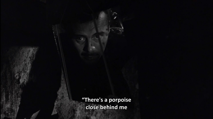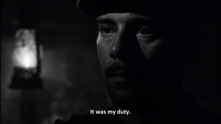 นี่เป็นช็อตที่ผมรู้สึกว่าตราตรึงที่สุดของหนัง Captain Hargreaves เหมือนตระหนักถึงคำตัดสินไม่น่าจะออกมาดีแน่ๆ (ตอนนั้นยังไม่มีใครรับทราบคำพิพากษา) คำขอบคุณของ Hamp จึงกลายเป็นสิ่งที่เขาไม่ต้องการยินยอมรับ พูดบอกว่านั่นคือหน้าที่ที่มันคงจะดีกว่าถ้าเหตุการณ์ดังกล่าวไม่เคยเกิดขึ้น ภาพเบลอๆของแสงจากโคมไฟดูเลือนลางสื่อถึงความท้อแท้สิ้นหวัง ใบหน้าของเขาก็ปกคลุมด้วยความมืดมิดเช่นเดียวกัน (หลายช็อตในซีเควนซ์นี้ ใบหน้าของ Cap. Hargreaves ก็มืดมิดสนิทเลยนะ)