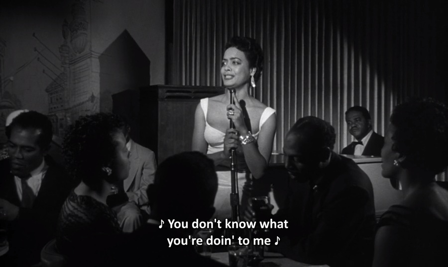 แต่พอเธอสามารถโบกขึ้นรถ เปลี่ยนบทเพลง Nat King Cole: Rather Have the Blues ท่วงทำนองเบาๆ สำแดงความรู้สึกผ่อนคลาย (=หญิงสาวครุ่นคิดว่าตนเองน่าจะหลบหนีได้สำเร็จ) จากนั้นฉายเครดิตย้อนศร เลื่อนจากบนลงล่าง เหมือนเป็นการบอกใบ้หายนะ ทุกสิ่งอย่างจะพลิกกลับตารปัตรจากที่ผู้ชม/หญิงสาวครุ่นคิดเข้าใจ