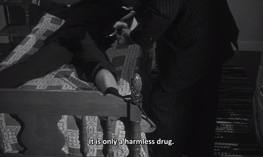 Hays Code มีกฎห้ามฉายให้เห็นภาพการเสพยา ด้วยเหตุนี้ชายสวมสูทรองเท้าหนัง (Dr. Soberin) จึงต้องพูดอธิบายกำลังจะฉีดอะไร Sodium Pentothal บอกว่ามันไม่มีพิษภัยต่อร่างกาย แค่ทำให้มึนๆเมาๆ แล้วเอ่ยกล่าวบางสิ่งอย่างออกมาโดยไม่รับรู้ตัว … เป็นการท้าทายกฎของ Hays Code ได้อย่างแสบกระสันต์