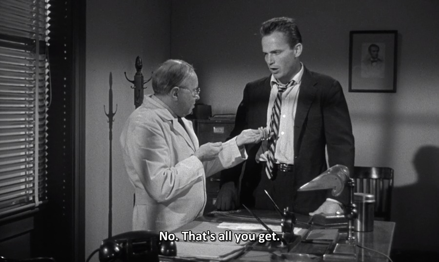 ตามวิถี Hays Code หนังไม่ฉายให้เห็นว่า Mike ทำอะไรลูกสมุนของ Carl จนลงไปนอนกองกับพื้น แต่ปฏิกิริยาของลูกสมุนอีกคนที่รีบเผ่นหนี สีหน้าตกใจ มันต้องเป็น WTF! เกินบรรยาย