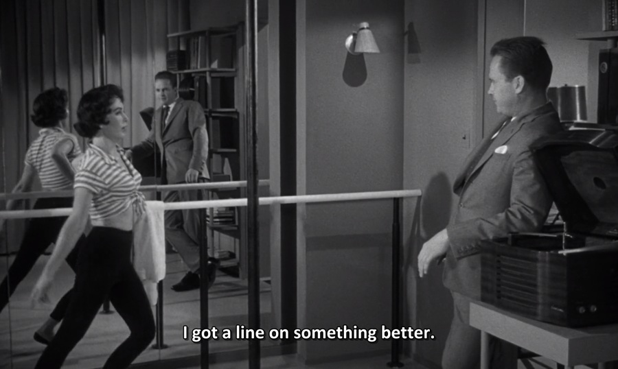 Mike เดินทางมาหาเลขา/แฟนสาว Velda กำลังซ้อมเต้น โยกไปโยกมาในห้องกระจก ราวกับต้องการสื่อถึงภาพสะท้อนตัวตน ทั้งสองมีความละม้ายคล้าย เติมเต็มกันและกัน (พร้อมจะเอาตัวเขาแลกเพื่อให้ได้ในสิ่งที่ต้องการ) จากนั้นเธอพยายามยั่วเย้า เต้นรูดเสา หมุนวงกลม ชักชวนเขาร่วมเพศสัมพันธ์ … แต่อีกฝ่ายต้องแสดงออกว่ากามตายด้านเพราะกองเซนเซอร์ Hays Code