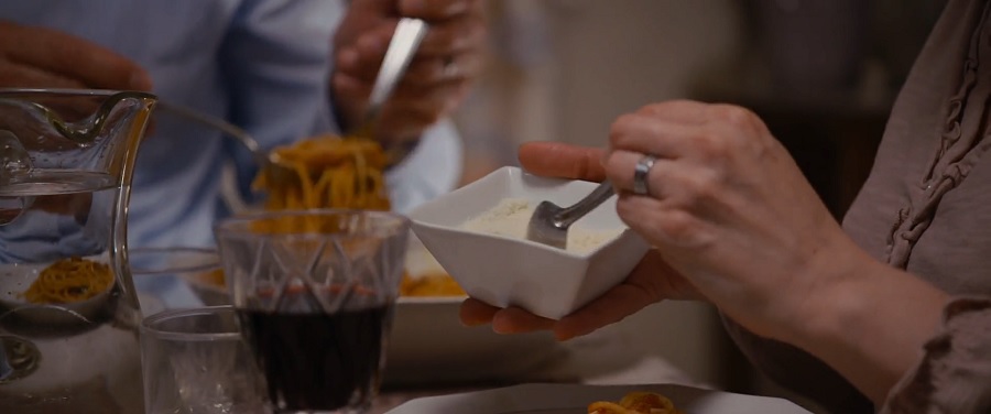ฝั่งของ Adèle รับประทานสปาเก็ตตี้ (น่าจะมีตบอล) เคียงคู่ไวน์แดง อาหารเลิศหรูหราของคนชนชั้นแรงงาน (Working Class) เรื่องสนทนาก็เกี่ยวกับการดิ้นรนเอาตัวรอด ทำการทำงานเป็นหลักแหล่ง แต่งงานเพื่อชีวิตมั่นคง (รูปธรรมจับต้องได้) และพวกเขาครุ่นคิดว่า Emma คือรุ่นพี่ที่มาสอนปรัชญา ยินยอมรับไม่ได้ถ้าลูกคือเลสเบี้ยนรักหญิง