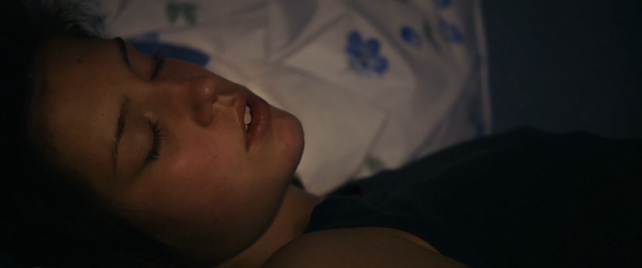 สังเกตลวดลายหมอน ดอกอะไรก็ไม่รู้สีน้ำเงิน … สะท้อนถึงความสุขชั่วขณะนี้ของเธอ อยู่ในการหลับฝันดี
