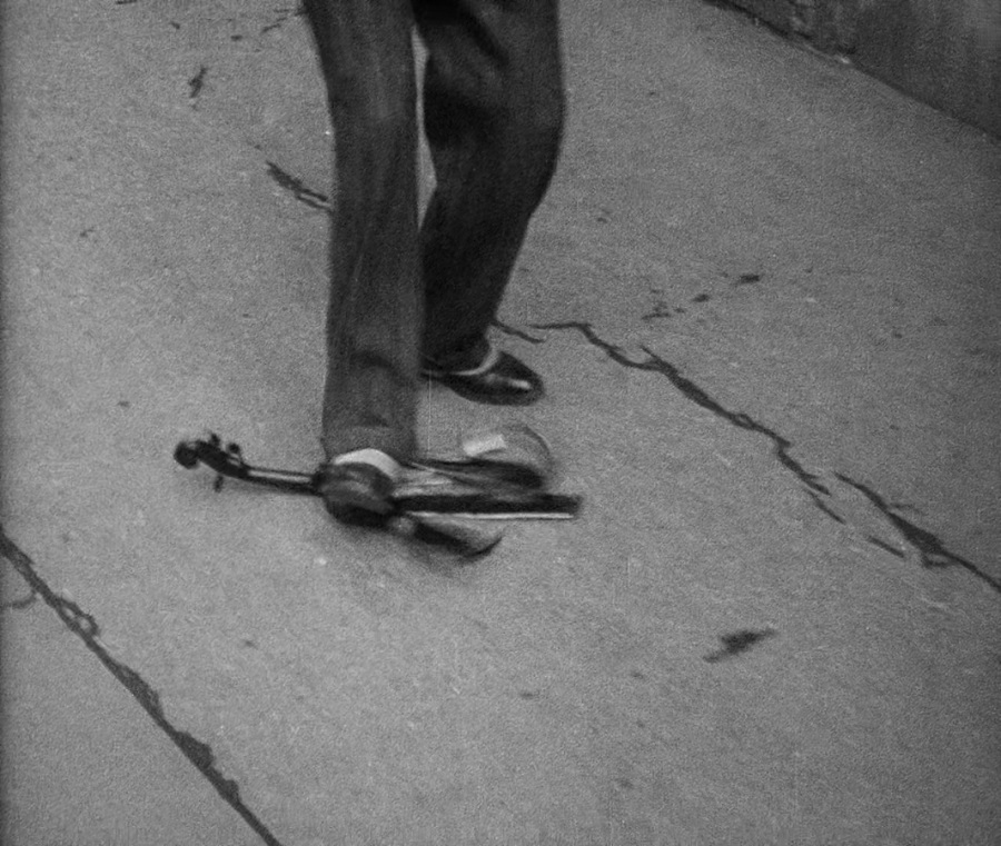 ชายคนหนี่งเดินเตะแล้วเหยียบย่ำไวโอลิน (ในวันอาทิตย์) สื่อความถีงหลักคำสอนของคริสตจักร พยายามเสี้ยมผู้คนให้ทำลายคุณค่างานศิลปะ ไม่ต้องการให้เรียนรู้จักความงดงามชีวิต จำเป็นต้องถูกควบคุมครอบงำด้วยข้ออ้างหลักศีลธรรมจรรยา เพื่อตนเองจะได้มีอิสรภาพกระทำอะไรก็ได้ใจพีงปรารถนา