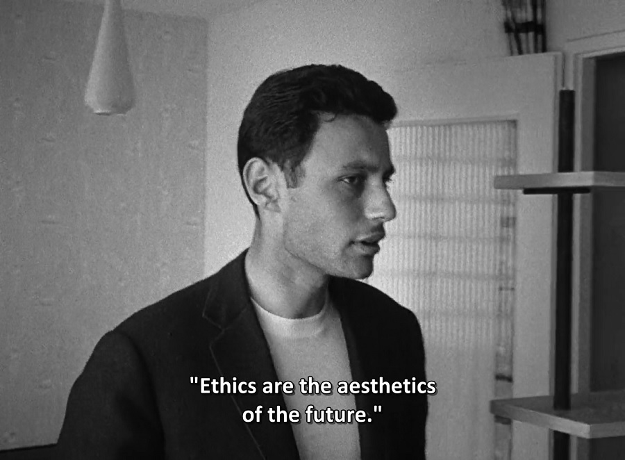 ผมมองเห็น Le petit soldat (1963) นำเสนอวิธีการจีบสาวในสไตล์ Godard คงไม่ต้องอธิบายกระมังว่าทำยังไง แต่ถ้าเป็นผู้หญิงสมัยนี้เชื่อว่าไม่น่าจะยินยอมรับการถูกบีบบังคับ ด้วยคำพูดลวงล่อหลอก กลับกลอกปอกลอก หลงคารมคนง่ายๆลักษณะนี้ (แต่ก็ไม่แน่นะครับ สวยใสไร้สมองหรือพวกสนแต่ชื่อเสียงเงินทองก็มีมากมายถมไป)