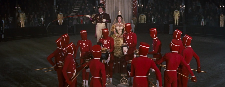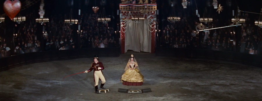Lola Montès เป็นหนึ่งในภาพยนตร์ใช้ประโยชน์จากความกว้างงงของ CinemaScope ได้อย่างชาญฉลาด คุ้มค่าที่สุดเรื่องหนึ่ง ซึ่งผมจะค่อยๆทะยอยกล่าวต่อไปนะครับ ขอเริ่มต้นด้วยเต้นท์คณะละครสัตว์ สามารถเก็บภาพการแสดงได้ทั้งเวทีในช็อตเดียว! แต่นั่นก็สร้างปัญหาเล็กๆ แก้โดยต้องยัดเยียดรายละเอียดน้อยๆ ใส่เข้าไปมากมายเพื่อเติมเต็มพื้นที่ว่างเหล่านั้น