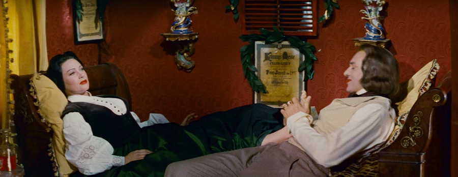 เมื่อเคลื่อนกล้องใกล้เข้ามาอีก ความกว้างงงของ CinemaScope พอดิบพอดีกับความกว้างของเตียงนอน Franz Liszt นวดฝ่าเท้าให้ Lola Montes สะท้อนถึงการเดินทางที่คงเหน็ดเหนื่อยอ่อนล้า … นี่เป็นเปรียบเปรยเชิงสัญลักษณ์นะครับ เพราะเห็นเธอเอาแต่นอน ไม่ได้ก้าวเดินไปไหนด้วยซ้ำ มันจะเมื่อยฝ่าเท้าได้อย่างไร