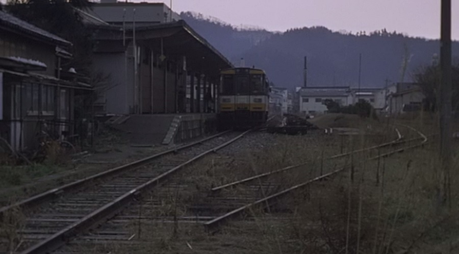 หลายปีถัดไปก็ถึงเวลาออกเดินทาง ขึ้นรถไฟมุ่งสู่สุดปลายเขตแดนตะวันตกประเทศญี่ปุ่น (ตะวันตกในความเชื่อคนไทย/ญี่ปุ่น เหมือนกันคือ ทิศทางของคนตาย) สังเกตว่าช็อตนี้เลือกตำแหน่งเห็นสองรางรถไฟ หนึ่งไปต่อได้ สองคือขาดแหว่ง (รอยต่อของการสลับรางรถไฟ) นัยยะก็คือชีวิตเดินทางมาถึงสุดปลายเขตแดนที่จะมาถึงแล้ว มิสามารถไปต่อจากนี้ได้