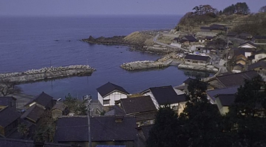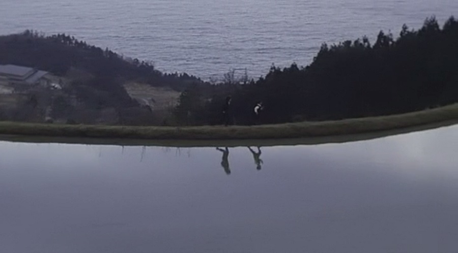 ช็อตสวยเกือบที่สุดของหนัง เป็นการแพนกล้องจากด้านหนึ่งไปอีกด้านหนึ่ง เด็กๆสองคนวิ่งเลียบเนินคันดิน เห็นเงาสะท้อนในอ่างเก็บน้ำที่แน่นิ่ง พื้นหลังคือทะเลญี่ปุ่นเต็มไปด้วยคลื่นลม