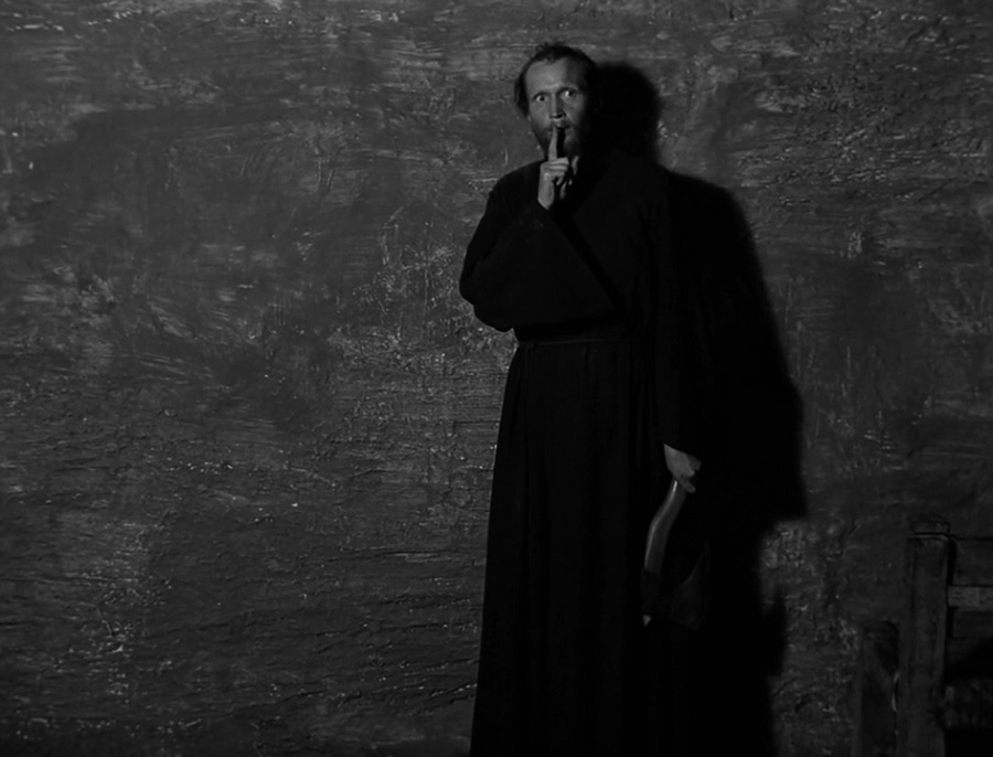 นี่เป็นอีกช็อตที่ใช้ประโยชน์จากฟีล์มขาวดำได้ทรงพลังมากๆ เพราะบาทหลวง Józef Suryn สวมชุดสีดำ มันเลยมีความกลมกลืนกับเงามืดที่อยู่ด้านหลัง จนให้ความรู้สึกเหมือนเป็นสิ่งๆเดียวกัน สื่อถึงการเข้าสู่ด้านมืด ยินยอมศิโรราบกับซาตาน โอบรับปีศาจร้ายเข้ามาในตนเอง และหันหลังให้มวลมนุษยชาติ