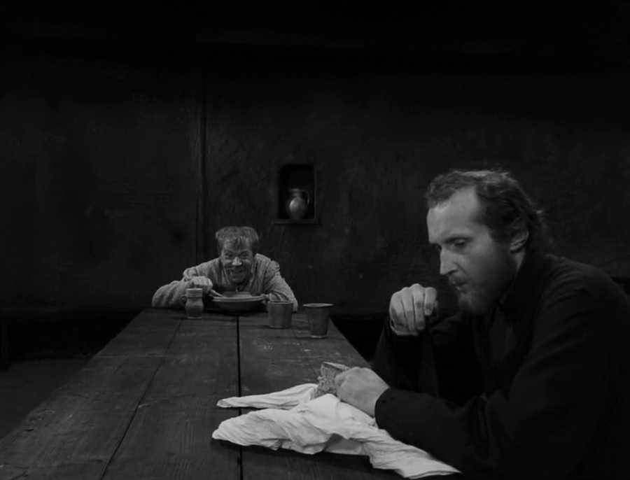 - บาทหลวง Józef Suryn นั่งอยู่ด้านข้าง (แสดงถึงผู้ทำตามกฎระเบียบ ข้อบังคับ) ท่าทางสงบเสงี่ยมเจียมตน รับประทานอาหารแต่น้อยนิด เพียงพอดี (จะว่าไปก็สอดคล้องสไตล์ ‘minimalist’ ของหนังด้วยนะ)