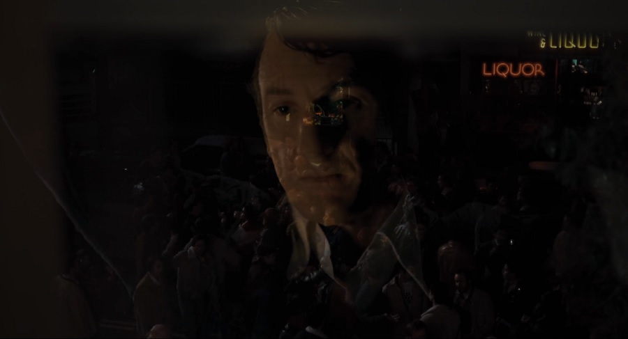 ผิดกับ Harvey Milk ช็อตนี้ยืนอยู่ตรงกระจกพบเห็นเงาสะท้อนเช่นกัน จับจ้องมองฝูงชนกำลังกรีธาเตรียมพลสำหรับเดินพาเรดประท้วงทางการ นั่นทำให้เขามิสามารถหลบซ่อน เก็บกักตัวอยู่ภายในเพื่อใครคนหนึ่ง จำต้องออกไปท่ามกลางฝูงชน ถึงตัวตายก็ยินยอมเสี่ยงเสียสละ