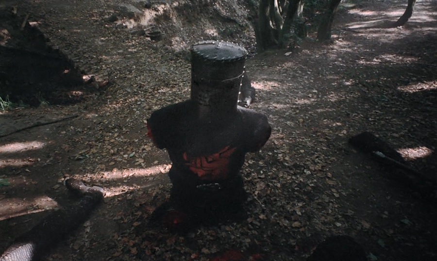 นักรบสวมชุดเกราะสองคนกำลังต่อสู้กัน Black Knight (รับบทโดย John Cleese) vs. Green Knight (รับบทโดย Terry Gilliam) แทนที่จะเข้าไปห้ามปราม King Arthur กลับยืนจับจ้องมอง สนเพียงผู้ชนะ แล้วเข้าไปชักชวนให้เข้าร่วมเป็นอัศวิน แต่ Black Knight กลับปฏิเสธเสียงขันแข็ง และไม่ยินยอมให้อีกฝั่งฝ่ายเดินข้ามสะพาน (เดินเลี่ยงไปทางอื่นก็ได้นะ ไม่เห็นจำเป็นต้องข้ามสะพานนี้เลย) พยายามต่อสู้ ขัดขืน เหมือนประชาชนลุกฮือขึ้นต่อต้านเผด็จการ ถูกตัดแขน ตัดขา (ใช้ตัวประกอบที่มีขาข้างเดียว) ก็ยังไม่ยินยอมรับความพ่ายแพ้