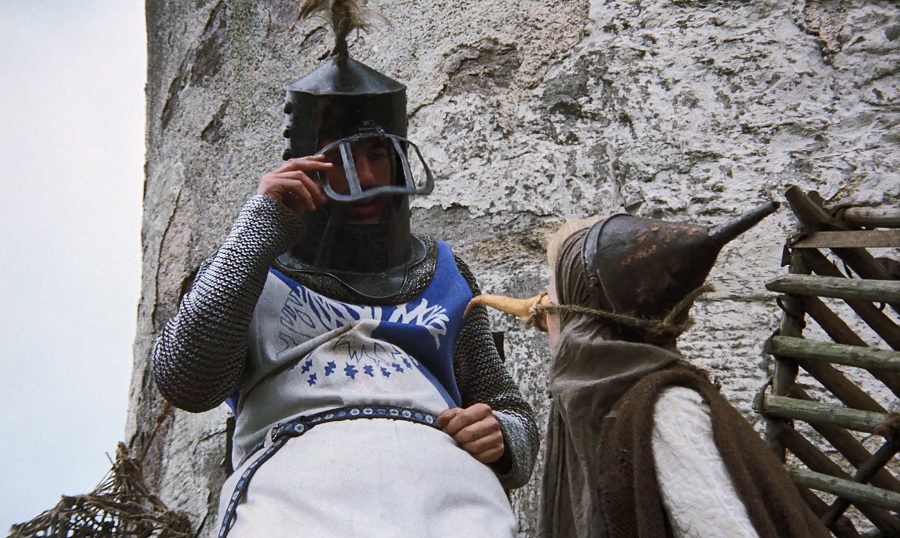 และฉากแรกของหนัง King Arthur (รับบทโดย Graham Chapman) กำลังติดตามหาอัศวินผู้กล้า แต่กลับเผชิญหน้ากับทหารยามที่เอาแต่สงสัย เอากะลามะพร้าวมาจากไหน เป็นการล้อเลียนมุกตลกนี้ได้อย่างยียวนกวนประสาท และยังสะท้อนไดเรคชั่นของหนัง พยายามเบี่ยงเบนความสนใจผู้ชมจากประเด็นหนึ่งสู่อีกประเด็นหนึ่ง ดำเนินไปเช่นนี้ตลอดทั้งเรื่อง