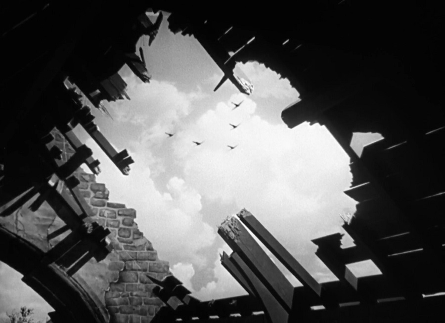 ค่ำคืนทิ้งระเบิด หนังไม่นำพาผู้ชมไปไกลมากกว่าแค่ภายในหลุมหลบภัย ในสายตาของ Mrs. Miniver เดี๋ยวมืดเดี๋ยวสว่าง รายล้อมรอบด้วยเสียง Sound Effect เครื่องบินโฉบเฉี่ยว ปืนกล ระเบิด ฯ โลกภายนอกช่างเต็มไปด้วยความว้าวุ่นวาย ส่งผลกระทบถึงภายใน(จิตใจคน)