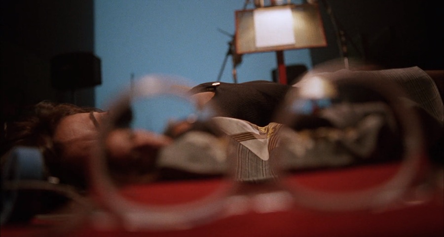 ระหว่างที่ Pepa กำลังพากย์เสียง Johnny Guitar (1954) ต่อจาก Iván ที่บันทึกเสียงไว้ก่อนหน้า ขณะกำลังอินกับบทสนทนา (เลือนลางระหว่างชีวิตจริง-บทพากย์ในภาพยนตร์) จู่ๆเธอเป็นลมล้มพับ ลงไปนอนกองกับพื้น ใครเคยรับชม Love Streams (1984) ของผกก. John Cassavetes ก็น่าจะมักคุ้นฉากคล้ายๆเดียวกันนี้ มันคืออาการเหน็ดเหนื่อยอ่อนล้าจิตใจ ส่งผลกระทบต่อสภาพร่างกาย … ถ่ายผ่านแว่นตาช็อตนี้ชวนนึกถึงภาพยนตร์ Strangers on a Train (1951)