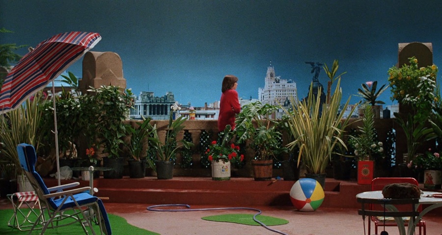 อย่างที่บอกไปว่า Women on the Verge of a Nervous Breakdown (1988) น่าจะเป็นครั้งแรกที่ผกก. Almodóvar สร้างฉากอพาร์ทเม้นท์ขึ้นภายในสตูดิโอ จงใจให้ผู้ชมสังเกตออกว่ามันคือฉาก สำหรับเลือนลางระหว่างชีวิตจริง-การแสดง … พยายามผสมผสานทุกสิ่งอย่างคลุกเคล้าเข้าด้วยกัน