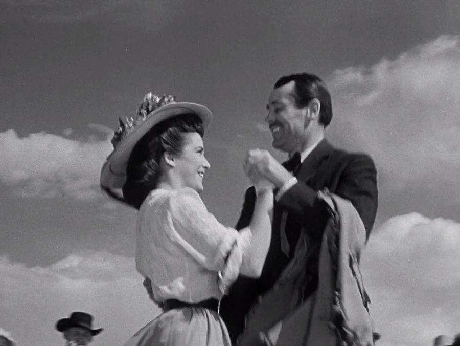 สำหรับมุมกล้อง หลายครั้งทีเดียวที่เงยขึ้นเห็นท้องฟ้า/ก้อนเมฆ ราวกับสรวงสวรรค์แห่งปลื้มปีติเป็นสุขใจ, อย่างช็อตนี้ที่ Wyatt Earp ได้เต็มรำกับนางฟ้า Clementine มุมกล้องช็อตหนึ่งจะเงยขึ้นถ่ายจากด้านล่าง เห็นชัดเลยว่าเขากำลังมีความสุขยิ้มร่า