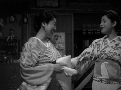 - Flowing (1956) นำเสนอฉากหลัง ความวุ่นๆวายๆของสาวๆเกอิชา ผ่านมุมมองแม่บ้าน/คนใช้ ทำได้เพียงจับจ้องมอง ปล่อยชีวิตล่องลอย เลื่อนไหล ทอดถอนหายใจ ไร้สิทธิ์เสียง ไม่สามารถทำอะไรสักสิ่งอย่าง