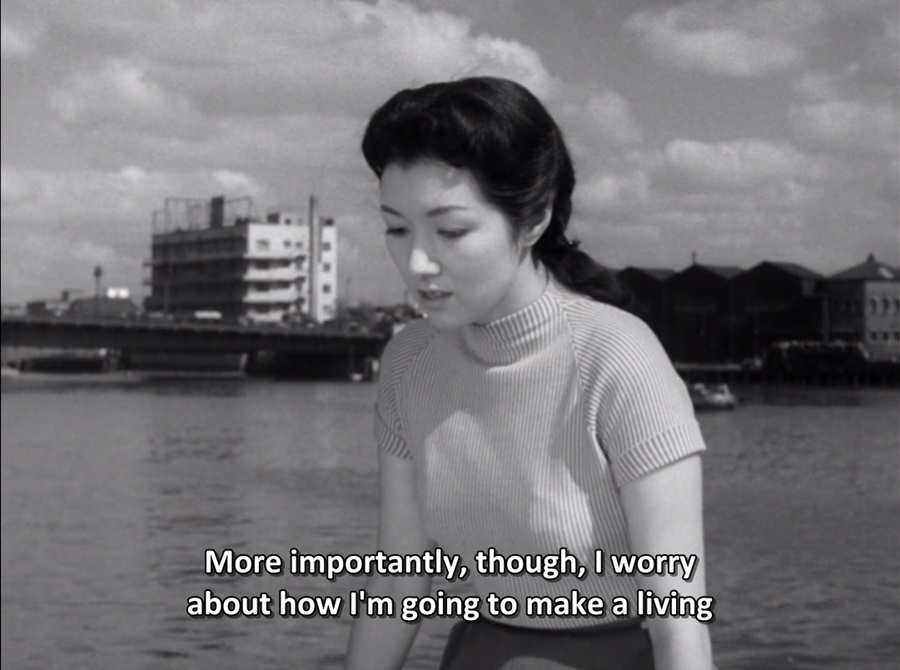 ถ้าไม่นับอารัมบท-ปัจฉิมบท ตลอดทั้งเรื่องมีเพียงซีเควนซ์นี้ที่ถ่ายติดแม่น้ำ (ผมขี้เกียจหาข้อมูลว่าแม่น้ำอะไร) Katsuyo และ (ใครสักคน) เดินเลียบริมตลิ่ง พูดคุยกันถึงอนาคตอาชีพเกอิชา แต่สิ่งที่เธอสนใจจริงๆคือพยายามมองหาอะไรที่ทำแล้วสร้างรายได้ สามารถพึ่งพา/เอาตัวรอดด้วยตนเอง … นั่นถือเป็นลักษณะของการว่ายทวนกระแสน้ำ (ทิศทางที่เธอก้าวเดิน ก็สวนทางกับเส้นทางน้ำไหล) ปฏิเสธทำตามวิถีที่มารดาพร่ำสอนสั่ง