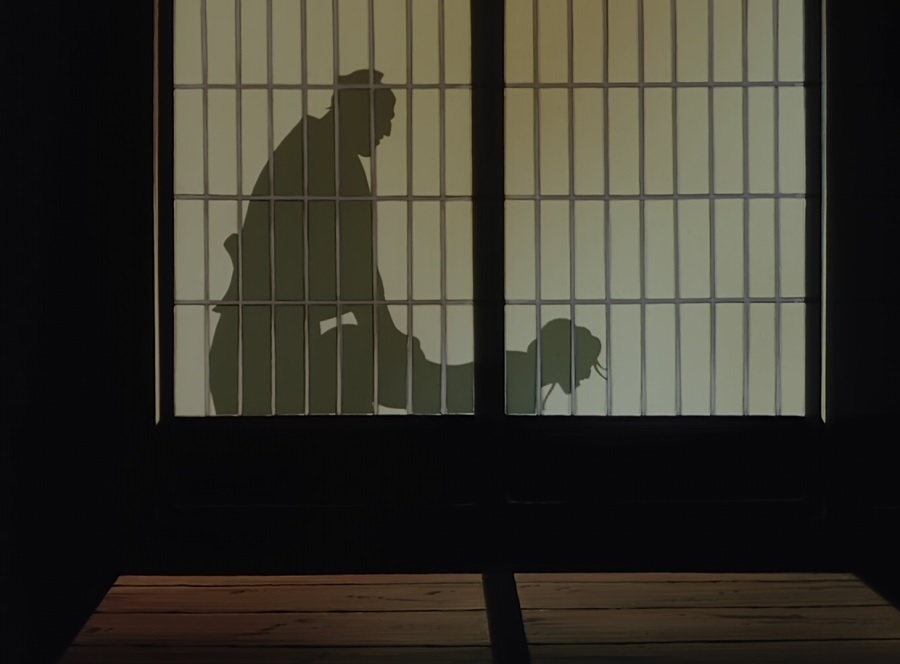 ขณะที่ Sex Scene อีกฉาก ที่บ้านของ Mochizuki clan เพื่อไม่ให้ติดเรตมากไป ใช้เงาบ่งบอกสิ่งที่เกิดขึ้นด้านหลังประตู และเสียงร้องอันเร่าร้อนรุนแรง สังเกตว่ามีการเลือกใช้แสงสีอ่อน ให้สัมผัสที่นุ่มนวลกว่า นี่คงเป็นการสมยอม แต่หญิงสาวคนนั้นคือใครกัน?