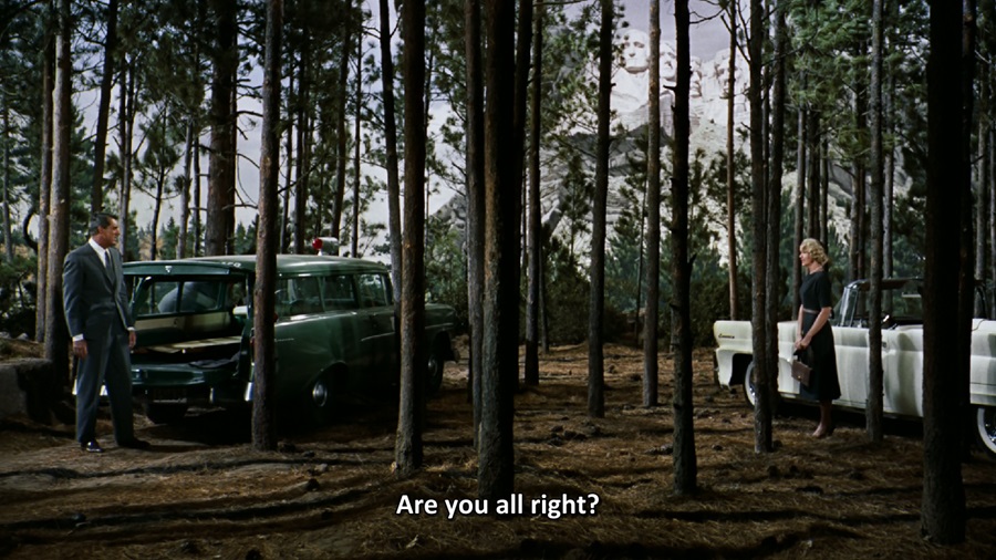 1. Establishing Shot เมื่อเริ่มซีนใหม่ทุกครั้ง Hitchcock จะเริ่มต้นจากใช้ภาพมุมกว้าง ให้เห็นภาพรวม (Overview) ของฉากโดยรอบ อาทิ สำนักงานใหญ่สหประชาชาติ เริ่มต้นฉากจะเห็นตึกทั้งหลัง, Mouth Rushmore เราจะเห็นรูปปั้นของ ปธน. ทั้งสีแบบเต็มๆตั้งแต่ครั้งแรกเลย ฯ, การเริ่มต้นด้วย Establishing Shot เหมือนการเกริ่นนำ แนะนำให้ผู้ชมได้รู้จักสถานที่ และเตรียมการคาดหวังว่ากำลังจะมีเหตุการณ์อะไรเกิดขึ้น