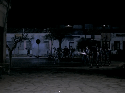 ส่วนหนึ่งอาจเพราะทุนสร้างจำกัด แต่เทคนิค “Off-Screen” คือหนึ่งในลายเซ็นต์ผกก. Angelopoulos ให้ผู้ชมขบครุ่นคิด จินตนาการเหตุการณ์บังเกิดขึ้นนอกจอภาพ อย่างฉากนี้จู่ๆได้ยินเสียงเครื่องบินทิ้งระเบิด ไฟฟ้าติดๆดับๆ นักแสดงหนีออกจากเวที ฝูงชนส่งเสียงเกรียวกราว ฯ คงคาดเดากันไม่ยากว่าเกิดเหตุการณ์อะไรขึ้น