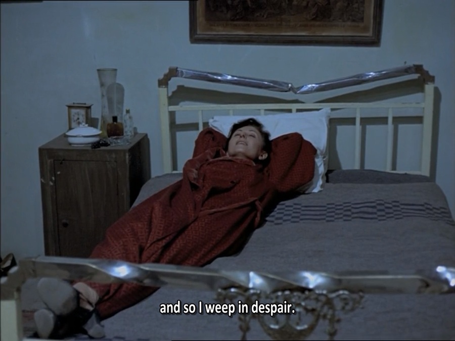 กล้องยังคงบันทึกภาพต่อไป (ถ่ายทำแบบ Long Take) เคลื่อนหมุนจากภายในสู่ภายนอก แล้ววนกลับกลับมาอีกรอบพบเห็น Aegisthos ก้าวเข้ามาในห้อง มุมกล้องเดียวกันเป๊ะๆ Clytemnestra ยังไม่ทันทำท่าอ่อยเหยื่ออะไร เขาก็เตรียมถอดเสื้อผ้า ปิดประตู สำแดงความลูกผู้ชาย ครอบครองเป็นเจ้าของ … จะตีความว่านี่คือสัญลักษณ์ของ Nazi Germany เข้ายึดครอง Greece ก็ได้กระมัง