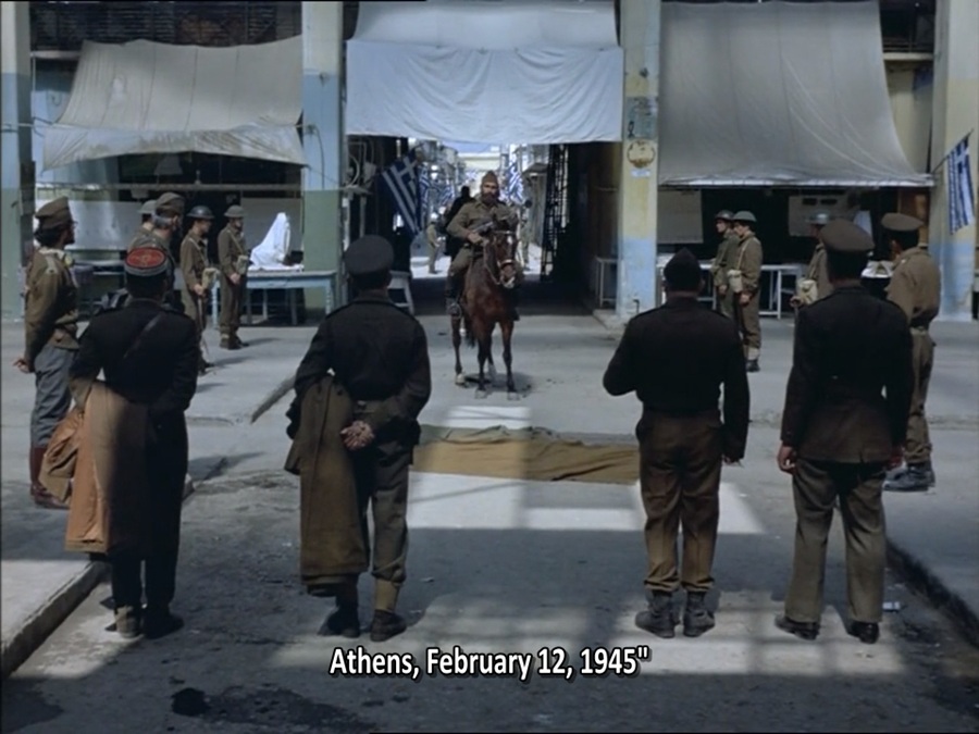 รับชมภาพยนตร์ของผกก. Angelopoulos ต้องตั้งใจจดใจจ่อ รับรู้ประวัติศาสตร์ และสังเกตรายละเอียดทุกสิ่งอย่าง สองภาพที่ผมนำมานี้เป็นสองช็อตต่อกัน เริ่มต้นคณะการแสดงก้าวเดินผ่านท้องถนน พบเห็นป้ายประกาศหาเสียง LONG LIVE MARSHALL PAPAGOS! นั่นคือเหตุการณ์เลือกตั้งใหญ่เดือนพฤศจิกายน ค.ศ. 1952