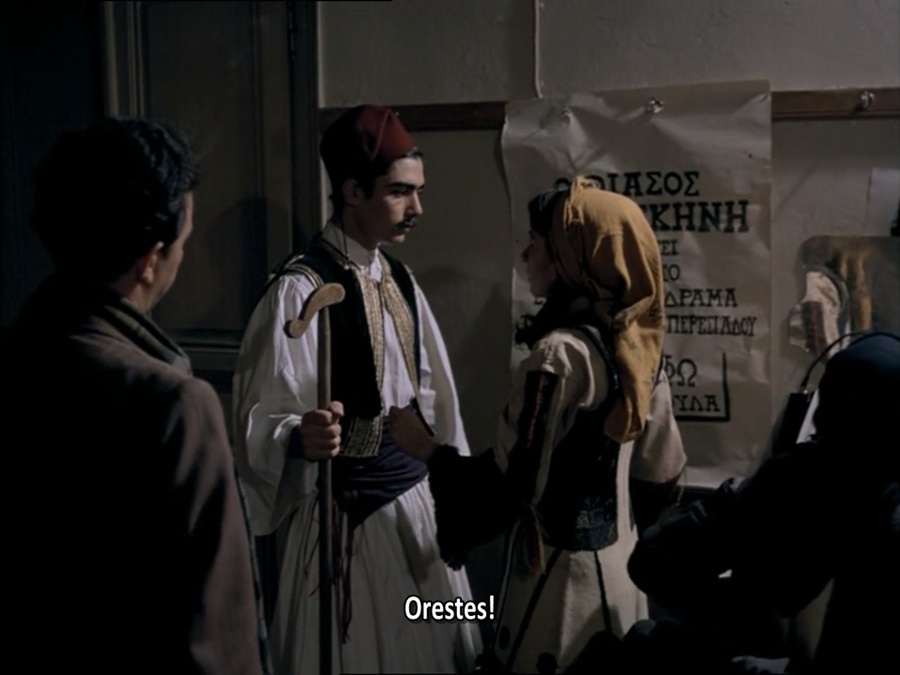 ปล. Aegisthos ไม่พึงพอใจที่ Pylades ขับร้องเพลง Θα ξανάρθεις อ่านว่า Tha Xanartheis แปลว่า You Will Return ซึ่งมีเนื้อหาสะท้อนอุดมการณ์เมืองฟากฝั่งตรงข้ามกัน นี่เป็นการอารัมบทสไตล์ของหนัง ก่อนนำเข้าสู่ฉากดวลเพลงกลางเรื่องระหว่างกลุ่มสนับสนุนคอมมิวนิสต์ (KKE) vs. ฝักใฝ่อังกฤษ/นิยมกษัตริย์ (Royalist)