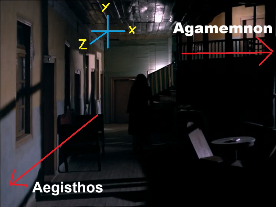 สังเกตว่าหนังไม่ได้แค่นำเสนอชั้นบน-ล่าง ขวาสุด-ซ้ายสุด แต่ยังมีระยะใกล้-ไกล เป็นการสร้างความแตกต่างระหว่าง Agamemnon vs. Aegisthos ในระดับสามมิติเลยก็ว่าได้!