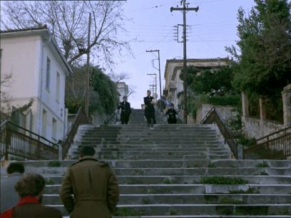 สามหนุ่มนักต่อต้านก้าวเดินขึ้นบันได สวนทางกับเจ้าหน้าที่ในเครื่องแบบ กำลังเร่งเรีบไปเตรียมงานต้อนรับวันพรุ่งนี้ … นี่เป็นการใช้ทิศทางขึ้น-ลง สะท้อนอุดมการณ์ทางการเมืองที่สวนทางกัน และสำแดงความครุ่นคิดเห็นของผกก. Angelopoulos ผ่านมุมมองฝั่งซ้าย (ขึ้นบันไดสู่ความยิ่งใหญ่ vs. ก้าวลงสู่ความตกต่ำ)