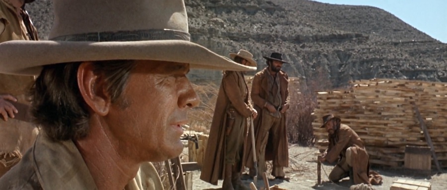 การปักหลักเขตแดนสำหรับสร้างสถานีรถไฟ เป็น Harmonica ครุ่นคิดขึ้นก่อนได้ นำเสามาตอกปักหมุดรูปสี่เหลี่ยมพร้อมๆกับเล่าเรื่องไปด้วย ซึ่งพอถึงจุดๆหนึ่ง Cheyenne ก็เริ่มติดตามทัน หยิบเชือกมามัดเข้ากับหลัก ภาพช็อตนี้เสร็จแล้วดึงลากมา แปลว่าเข้าใจตรงกันว่ากำลังจะทำอะไร