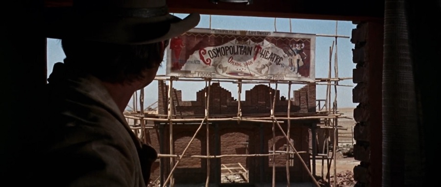 สถานที่แรกน่าสนใจมากๆ นักฆ่าหลบอยู่หลังผืนผ้าใบขนาดใหญ่ เขียนข้อความ Cosmopolitant Theatre หรือคือโรงละครที่ยังสร้างไม่เสร็จ นั่นสื่อนัยยะถึงฉากบังหน้า การเล่นละครตบตาเพื่อหักหลัง ตลบแตลง พรรคพวกเพื่อนเก่า