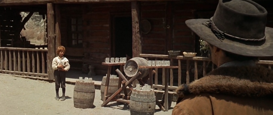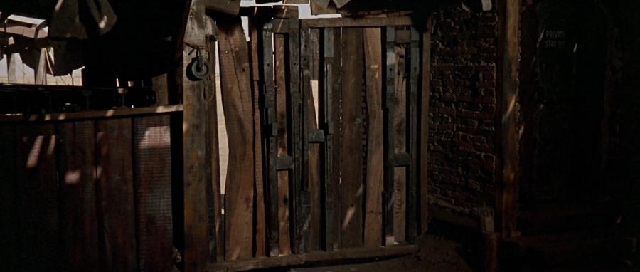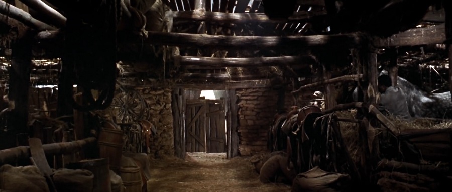 ถ้าเป็นพวกเทพนิยายที่เริ่มต้นด้วย กาลครั้งหนึ่งนานมาแล้ว… มักจะเป็นการเปิดหนังสือ ขึ้นข้อความ หรือเสียงพูดบรรยาย, แต่สำหรับหนังเรื่องนี้คือใช้เท้าเปิดประตูผุๆพังๆ จากนั้นค่อยๆเคลื่อนกล้องจากเท้า ไล่ขึ้นถึงเอวสะพายปืน และใบหน้า ซึ่งสามารถสะท้อนได้ถึงวิวัฒนาการยุคสมัย จากพื้นจุดต่ำสุด -> ปืนคือสัญลักษณ์ของคนเถื่อน -> ศีรษะคือจุดสูงสุดแห่งอารยธรรม