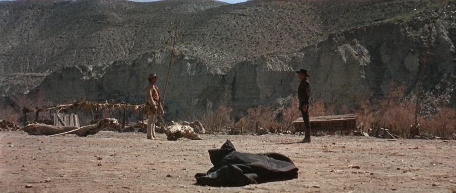 ช็อตลักษณะนี้ที่พบเห็นตัวละครระยะใกล้-ไกล มีความคมชัดกริบ คือ Deep Focus ที่รับอิทธิพลจาก Rashômon (1950) ถือเป็นอีกลายเซ็นต์ผู้กำกับ Leone