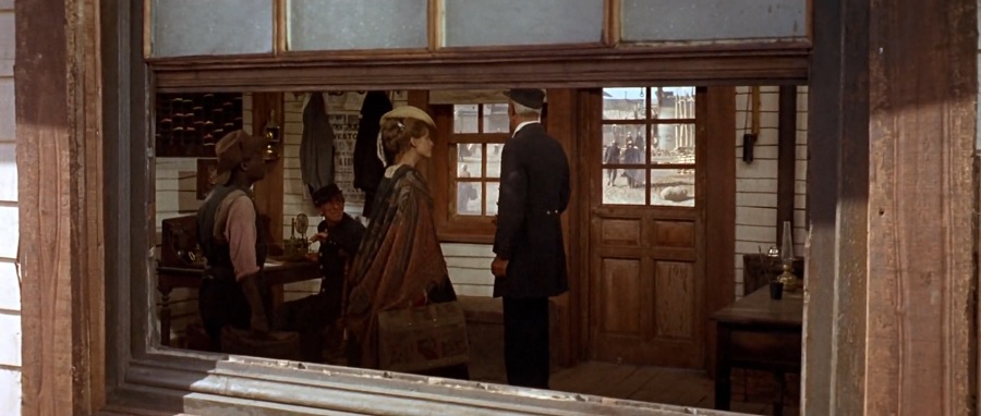 ผู้กำกับ Leone คงมีความเพลิดเพลินกับการใช้เครนเป็นอย่างมาก ก่อนมาถึงช็อตนี้ลากยาวตั้งแต่ตัวละครของ Claudia Cardinale เดินเข้าอ๊อฟฟิสสถานีรถไฟ จากนั้นพอเดินออกกล้องเคลื่อนขึ้น พบเห็นมุมกว้าง Bird Eye View ของเมือง Flagstone ประกอบพร้อม Main Theme ชวนให้ขนลุกซู่ซ่าสั่นสะท้าน