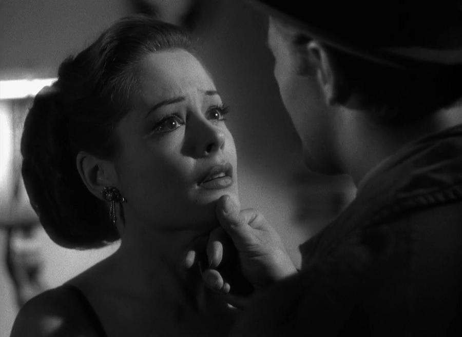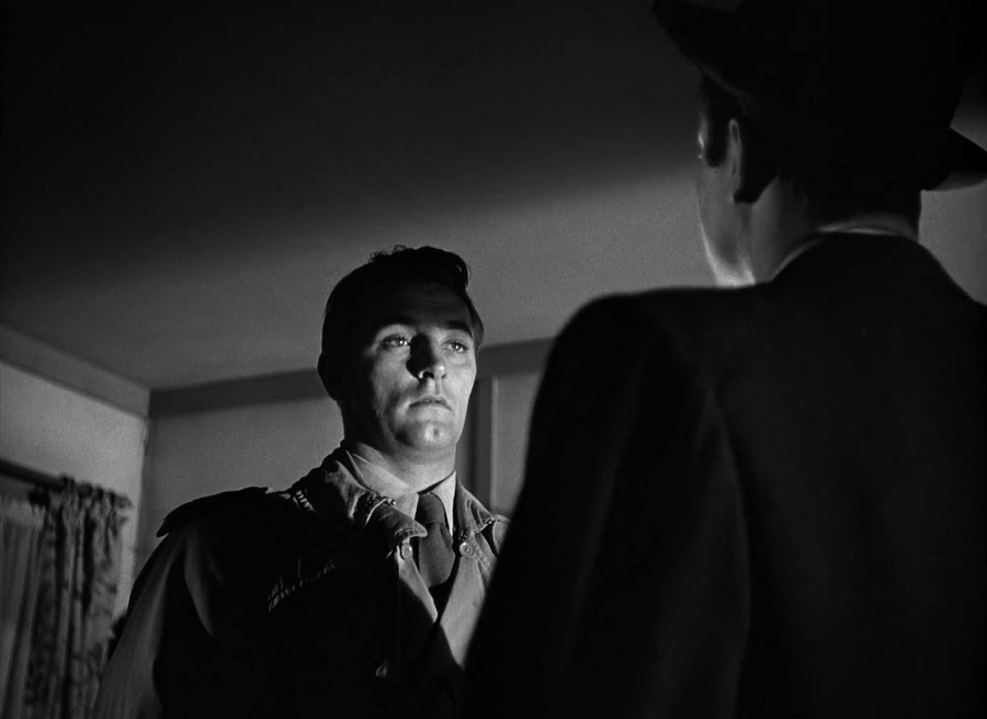 ยังอยู่ที่ริมชายหาด ช็อตถัดมานี้ก็แฝงนัยยะบางอย่าง สังเกตจากทิศทางใบหน้าของตัวละคร Mitchum เงยขึ้น 45 องศา ขณะที่ Greer ก้มลง 45 องศา ศีรษะของพวกเขาวางตั้งฉาก 90 องศา นี่ย่อมเป็นความจงใจอย่างแน่นอน นัยยะเดียวกับการจัดวางองค์ประกอบที่ผมว่าไป ความแตกต่างสุดขั้ว คนละทิศทางของตัวละคร
