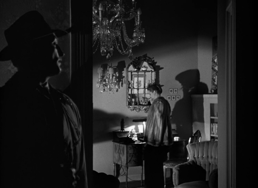 เงาของ Kathie ช็อตนี้ สังเกตว่ามีขนาดสูงใหญ่กว่าตนเอง อาบลงบนพื้นผนังที่มีลักษณะเหลี่ยมมุม นี่สะท้อนถึงแผนการของเธอขณะนั้น ต้องการพลิกหักหลัง Jeff ให้เขากลายเป็นแพะรับบาป ทุกอย่างจักได้จบสิ้นลงเสียที