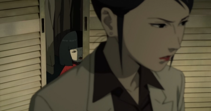 ในโลกความจริง อย่างที่บอกไปว่าการจัดโทนสีจะค่อนข้างจืดชืด แห้งแล้ง ดูไม่สดใสเท่าไหร่ แต่ไฮไลท์ของช็อตนี้ที่อยากให้สังเกตกันคือ เงา ด้านหนึ่งปกคลุมด้วยความมืดมิด (Osanai ยืนอยู่ฝั่งนี้) และอีกฝั่งแสงสว่างตัดกับเงามืด มีลักษณะเหมือนกรงขัง (Chiba ยืนฝั่งนี้)