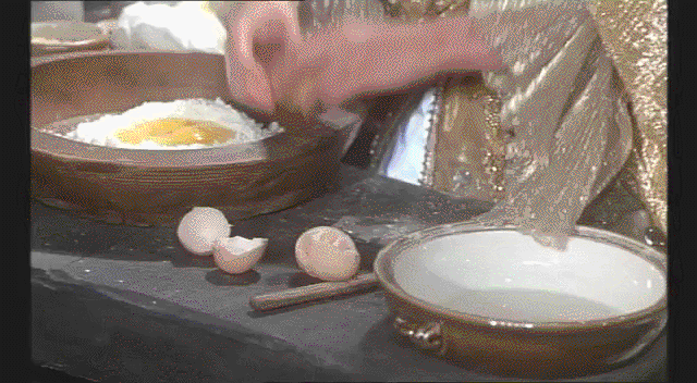 แต่บอกตามตรงฉากนี้แฝงนัยยะที่โคตรจะระริกระรี้ เหมือนปรุงยาเสน่ห์ … เริ่มต้นจากใช้คฑาถอดร่างกาย-จิตใจ พบเห็น Donkey Skin นั่งอยู่เฉยๆด้านหลัง ขณะที่เจ้าหญิงสวมชุดพระอาทิตย์กำลังเตรียมทำขนมปัง (สื่อนัยยะว่าเป็นการ(ตั้งใจ)ทำจากใจ) ซึ่งสูตรประกอบด้วยเทแป้ง ตอกไข่ ใส่แหวน และโน่นนี่นั่น จากนั้นนำมาคลุกเคล้า แล้วเอาเข้าเตาอบ สำเร็จแผนการไปอีกขั้น