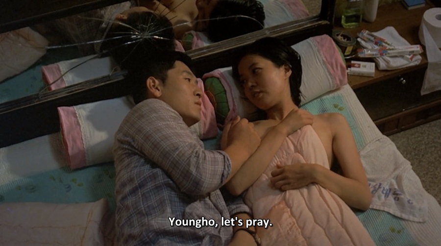 รอยแตกร้าวของกระจกบนหัวเตียง มันช่างพอดิบพอดีกับ Kim Yong-ho ซึ่งก็สื่อความหมายตรงไปตรงมาถึงสภาพจิตใจที่แตกสลาย สูญเสียตัวตน คนรัก จิตวิญญาณอันบริสุทธิ์ (loss innocence) และขณะนี้ยังอาจเหมารวมถึงพรหมจรรย์ของทั้งคู่ (เพศสัมพันธ์ครั้งแรก)